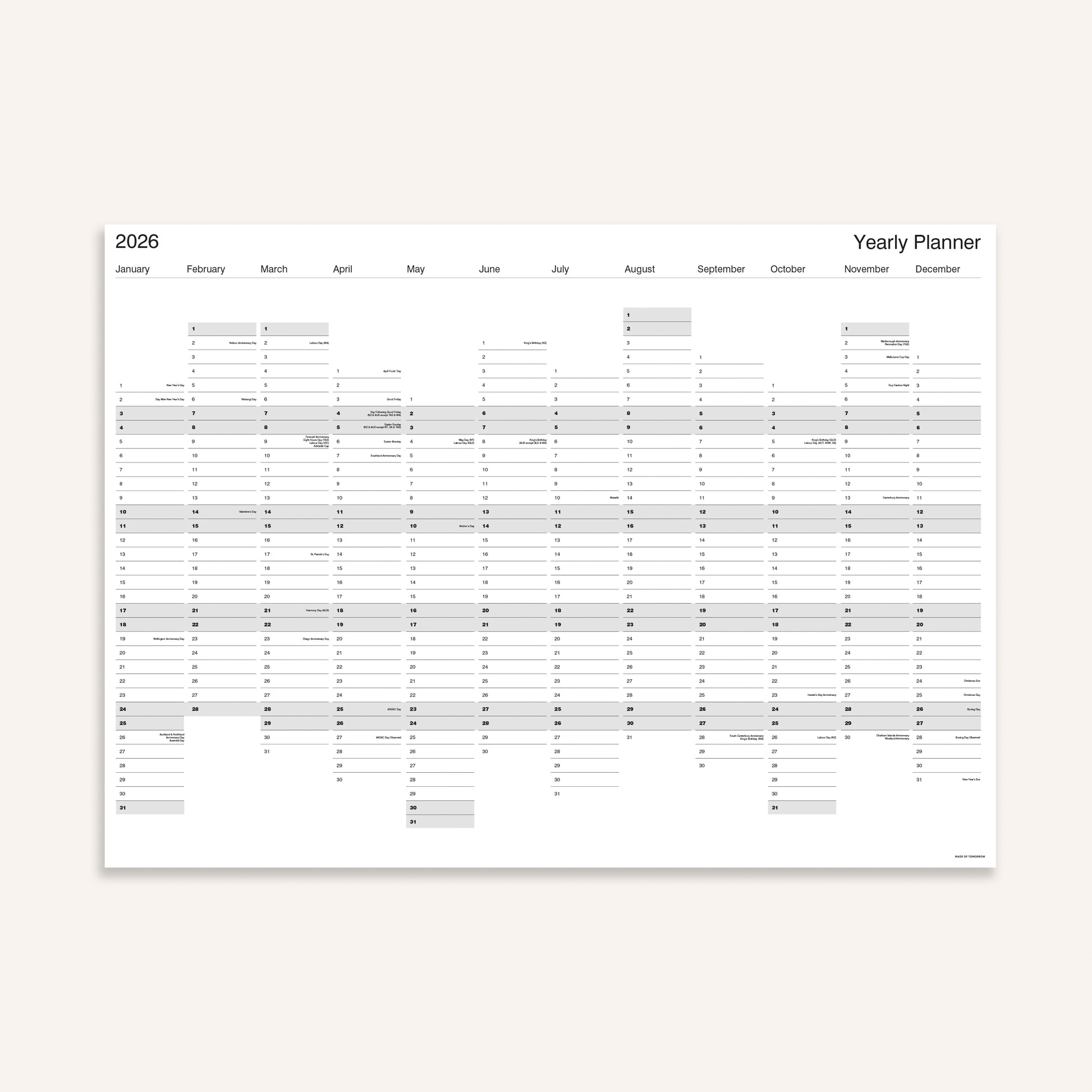 Elevate your planning game with our 2026 Yearly Wall Planner, available in A2 and A0 sizes. Effortlessly mount it using blu-tack or pins and enjoy a clear, full-year view for scheduling important dates, holidays, birthdays, and more.